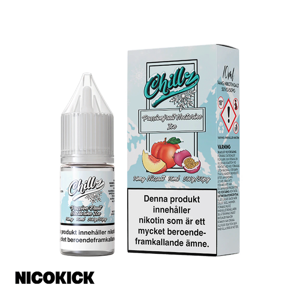 10ml Nic Salt E-juice 14mg från Chillz med smak av passionsfrukt, nektarin och cooling.