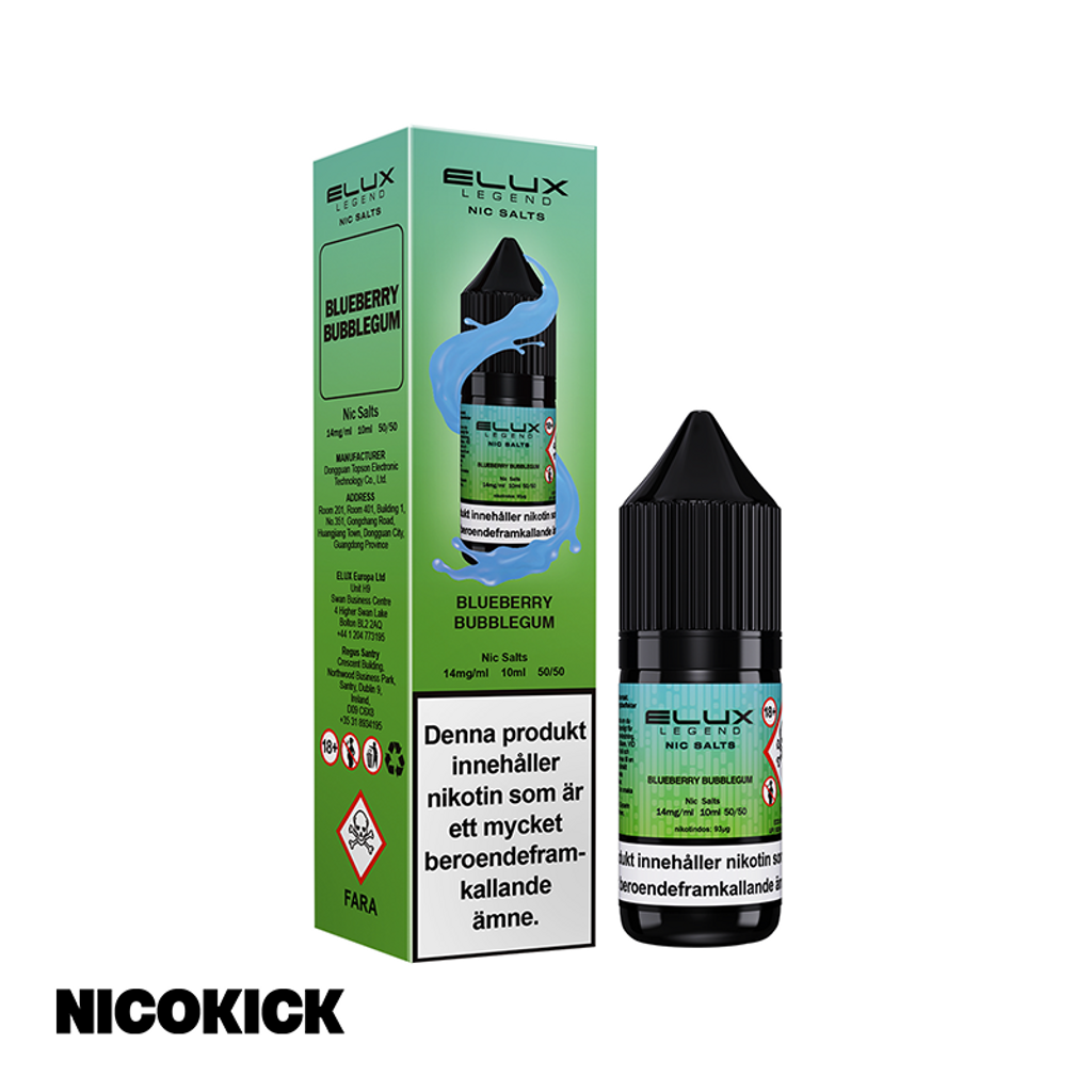 10ml E-juice med 14mg Nicsalt från Elux Legend med smak av blåbär och tuggummi.