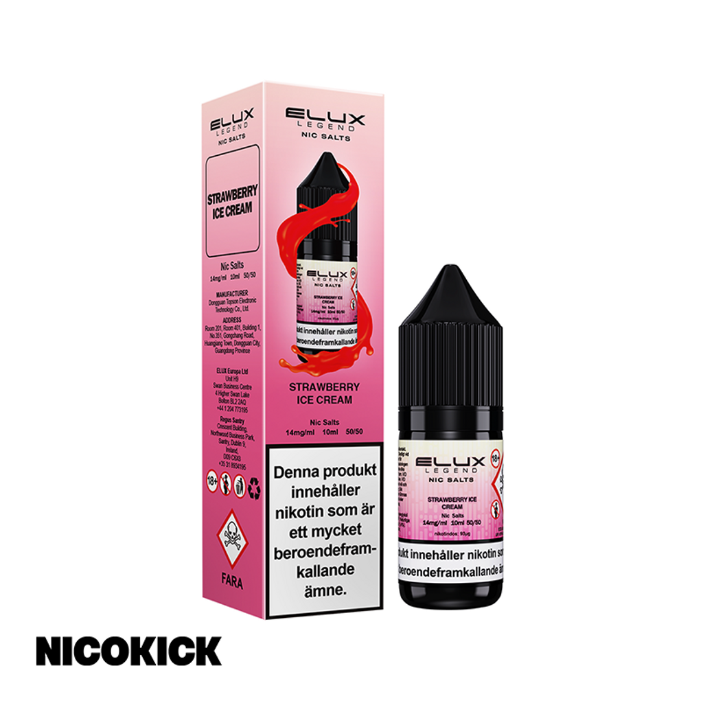 10ml E-juice med 14mg Nicsalt från Elux Legend med smak av jordgubb och vaniljglass.