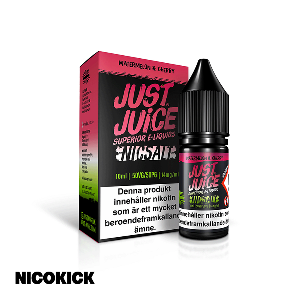 10ml E-juice med 14mg Nicsalt från Just Juice med smak av vattenmelon och körsbär.