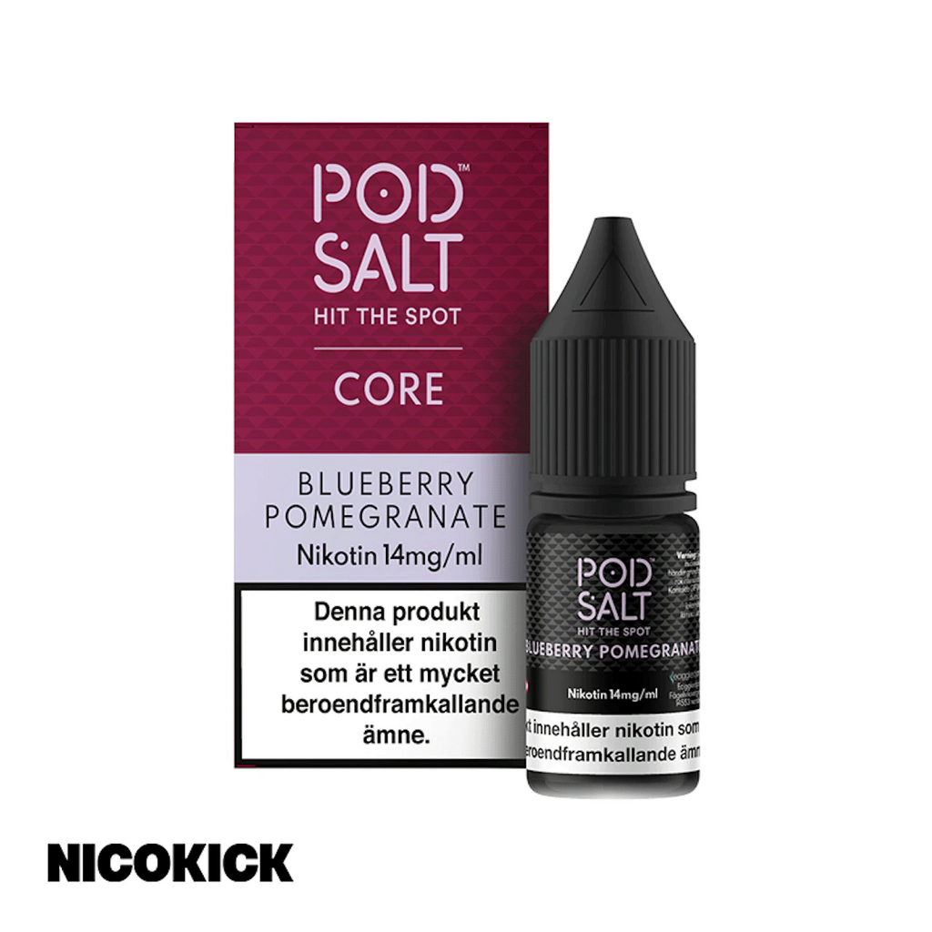 10ml E-juice med 14mg Nicsalt från Pod Salt, med smak av blåbär och granatäpple.