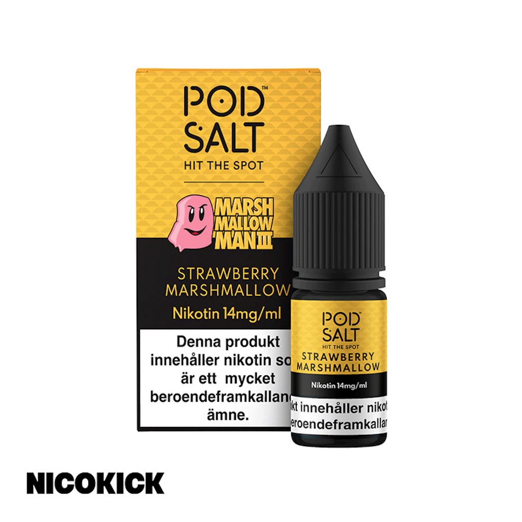 10ml E-juice med 14mg Nicsalt från Pod Salt med smak av jordgubb och marshmallow.
