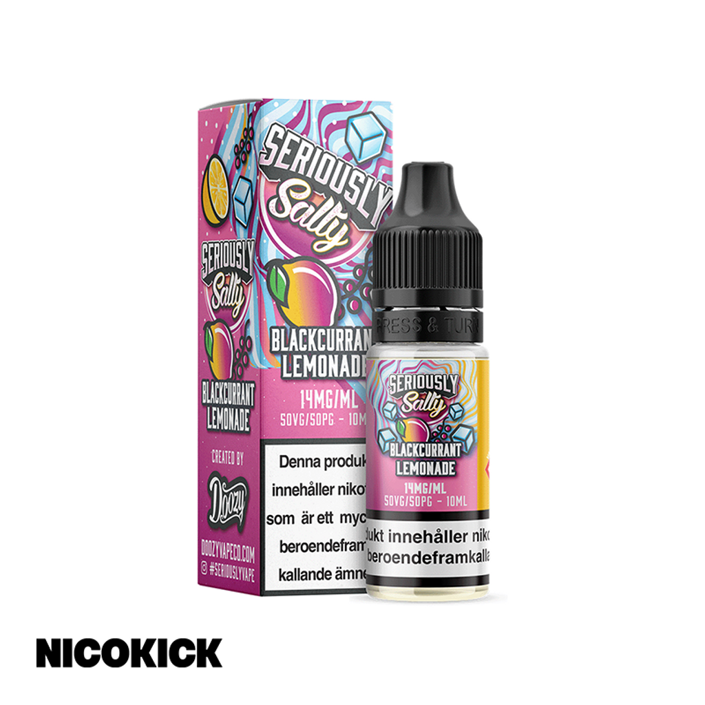 10ml E-juice med 14mg Nicsalt från Seriously med smak av svartvinbär och lemonad.