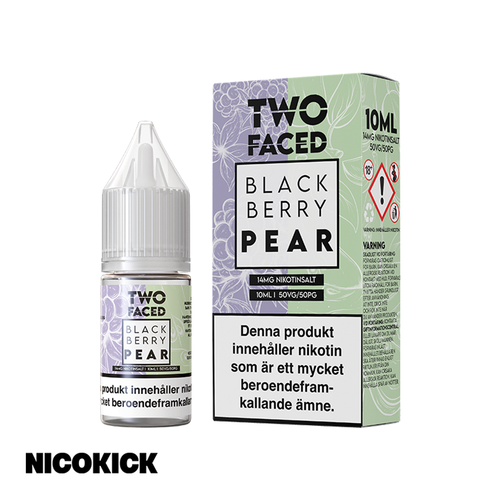 10ml E-juice med 14mg Nicsalt från Two Faced med smak av björnbär och päron.