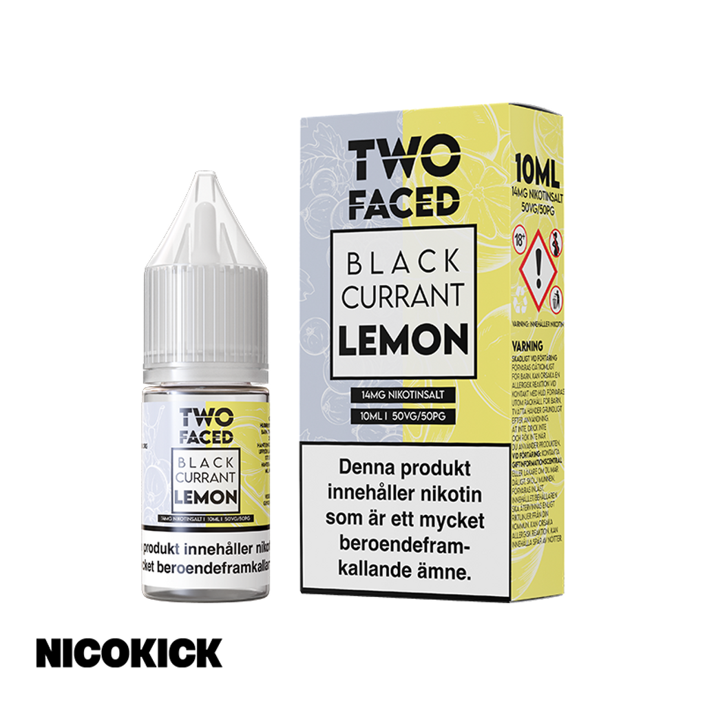 10ml E-juice med 14mg Nicsalt från Two Faced med smak av svartvinbär och citron.
