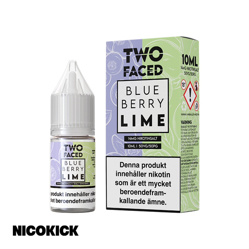 10ml E-juice med 14mg Nicsalt från Two Faced med smak av blåbär och lime.