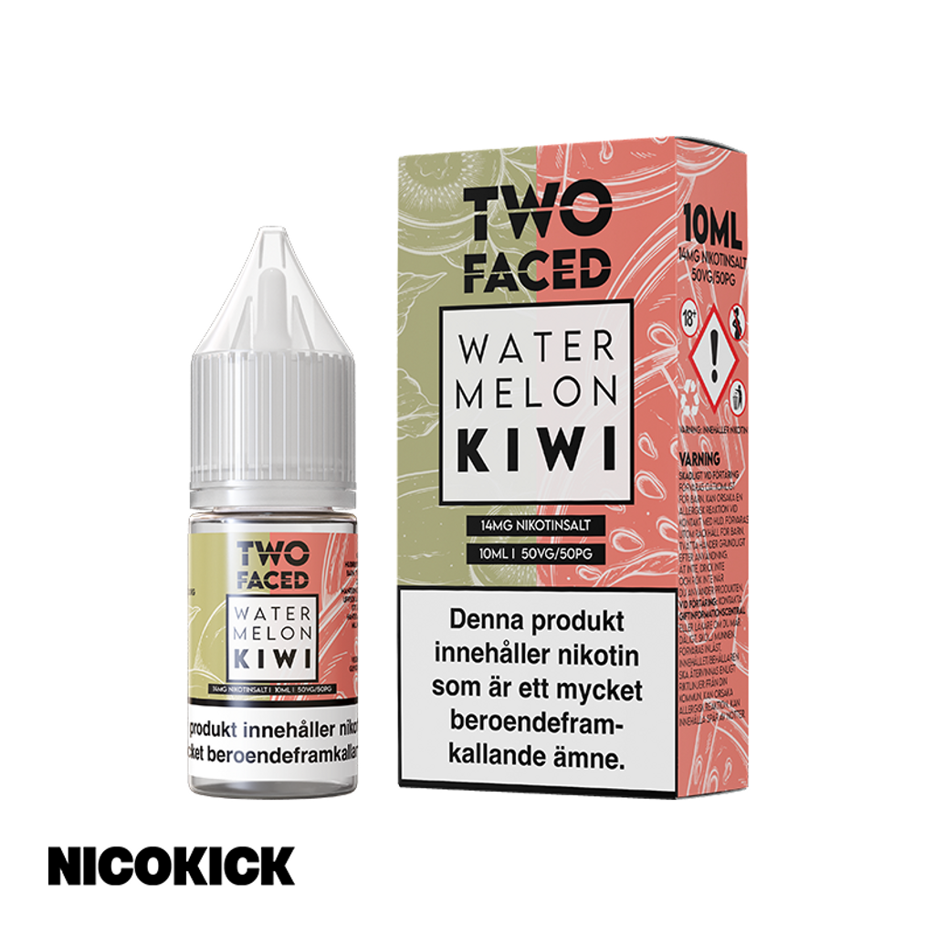10ml E-juice med 14mg Nicsalt från Two Faced med smak av vattenmelon och kiwi.